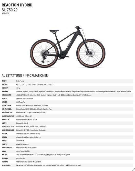 Bicicletă electrică Cube Reaction Hybrid SL, baterie 750 Wh